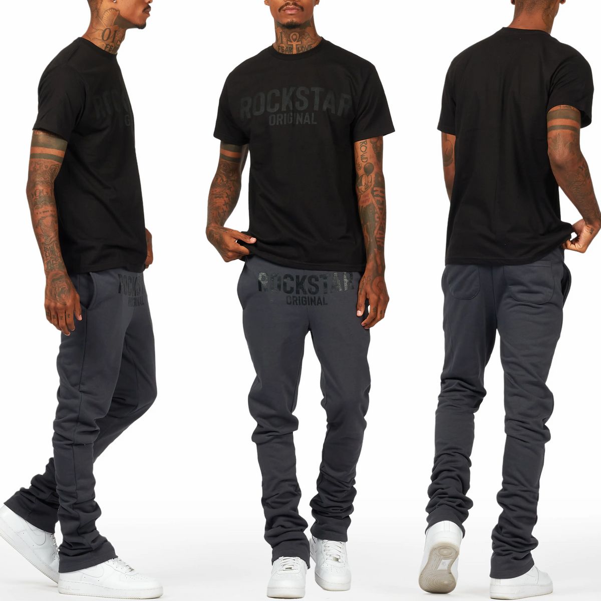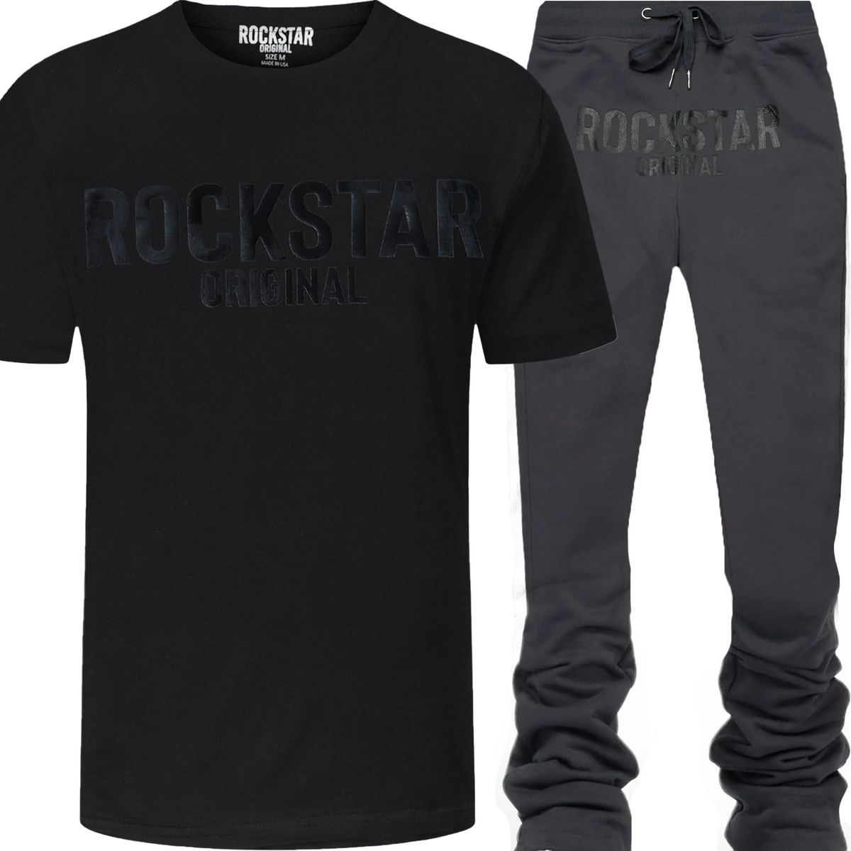 New collection ⚡Sizes S-2XL⚡️Top quality An urban two-piece t-shirt and super stacked pant tracksuit set for men in black. Designed with ultra soft fabric and extra long legs for a dope streetwear set.