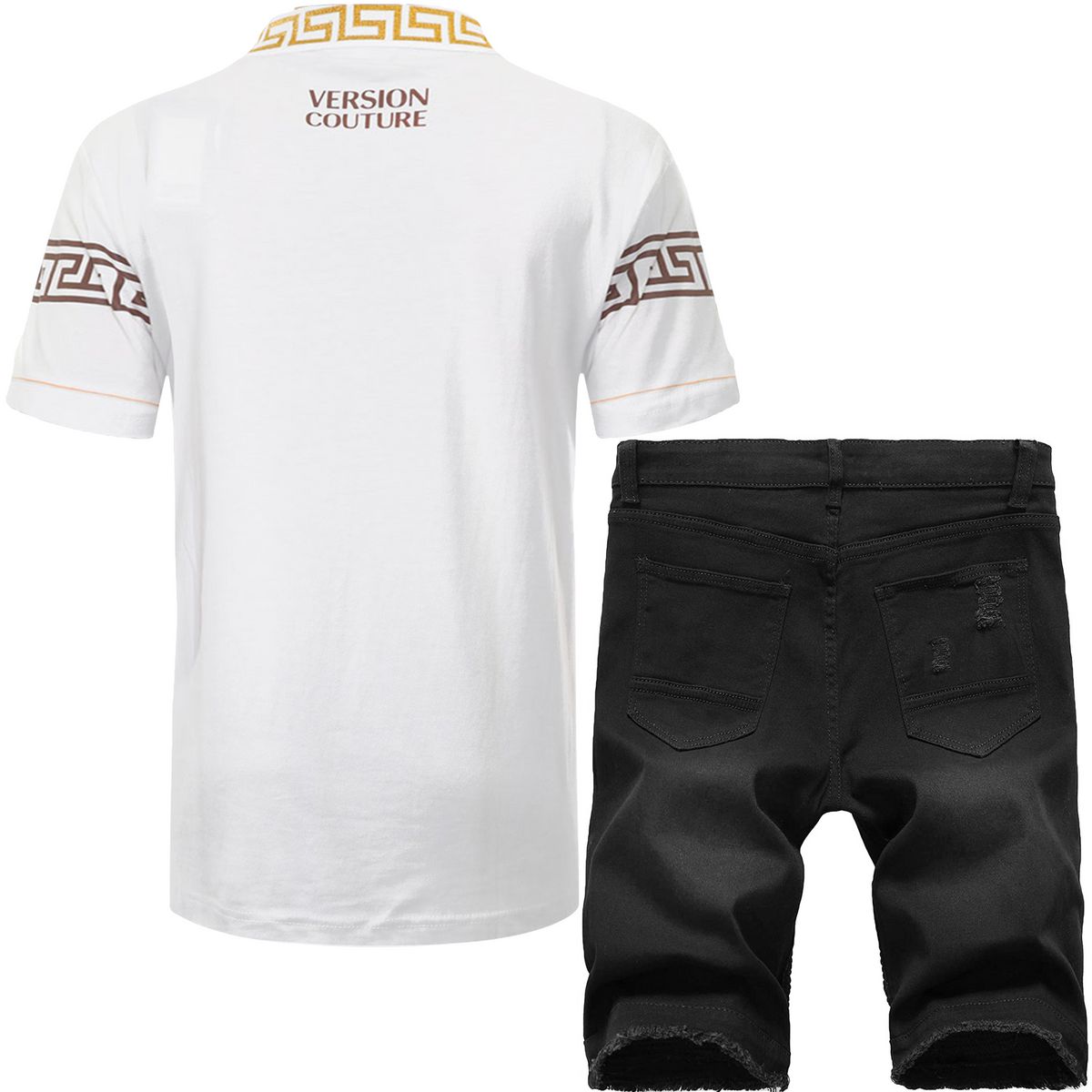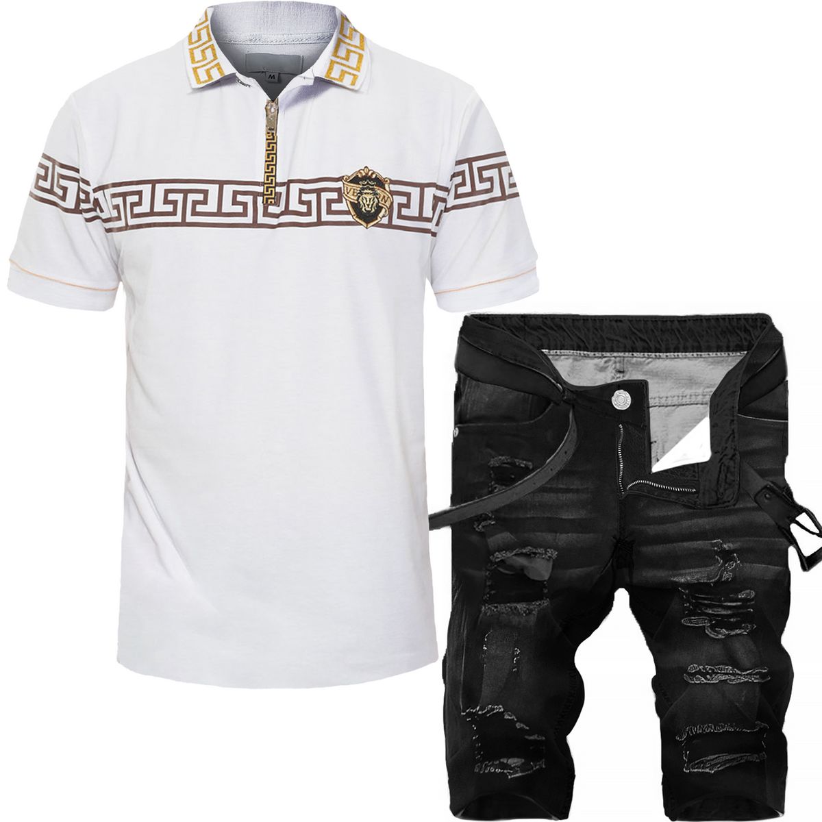 2pc Ripped Denim Shorts+Royal Print Polo Shirt ⚡