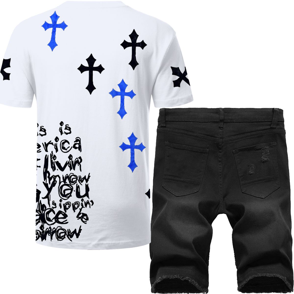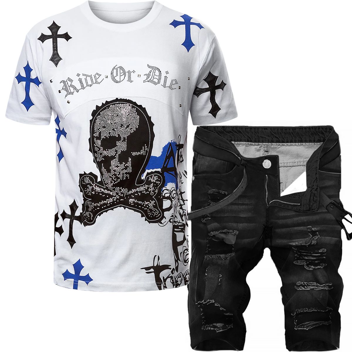 2pc Ripped Denim Shorts+AOP King Graffiti Print T-shirt ⚡