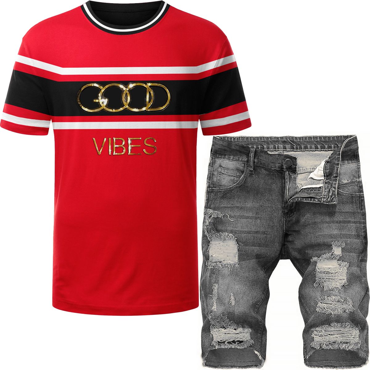 2pc Ripped Denim Shorts+Embossed Good Vibes T-shirt 💎