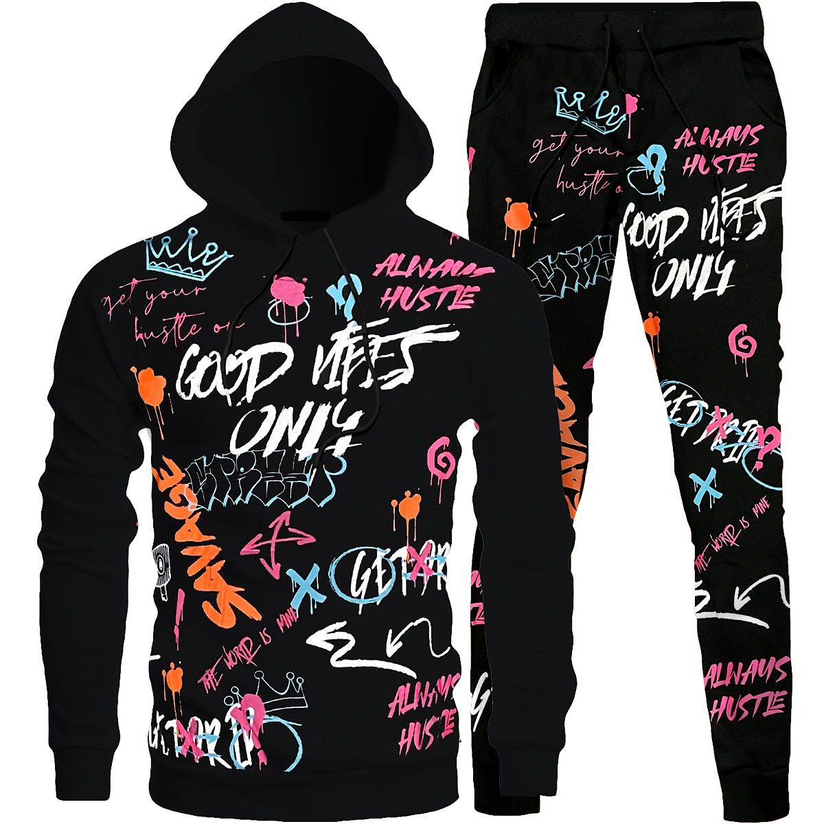 Bundle - 1081266 - 2pc Good Vibes Graffiti Hooded Tracksuit - black- M1031J - M1031H/M2537