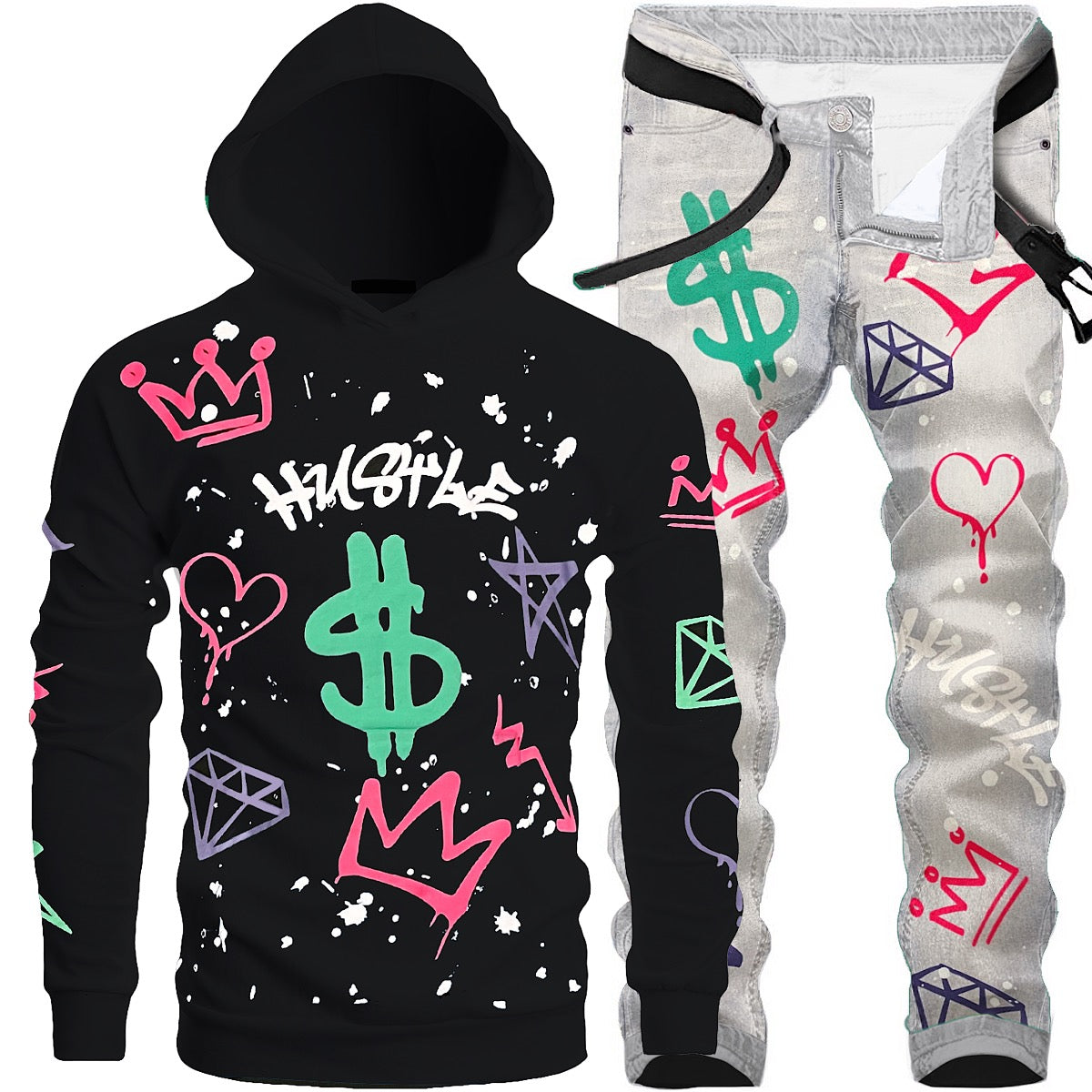 Bundle - 1092706 -Hustle Graffiti Hoodie+Skinny Hustle Graffiti Jeans- Black+Light Blue- M2536 + M5460D- GOTit/Waimea+RAMS/waimea