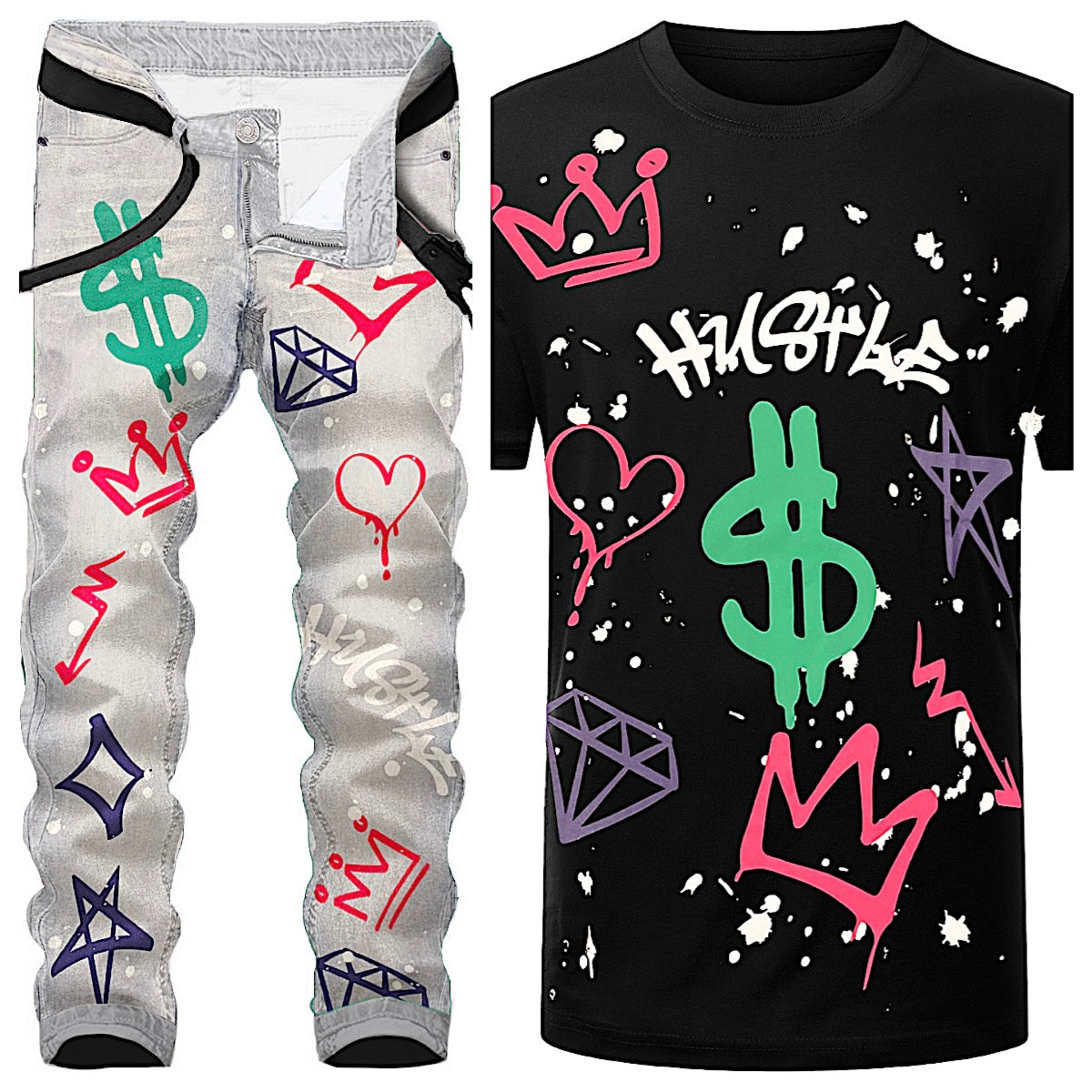 Bundle - 1129221 -Hustle Graffiti T-shirt+Skinny Hustle Graffiti Jeans- Black + Light Blue - M2542 + M5460D - GOTit/Waimea+waimea/RAMS