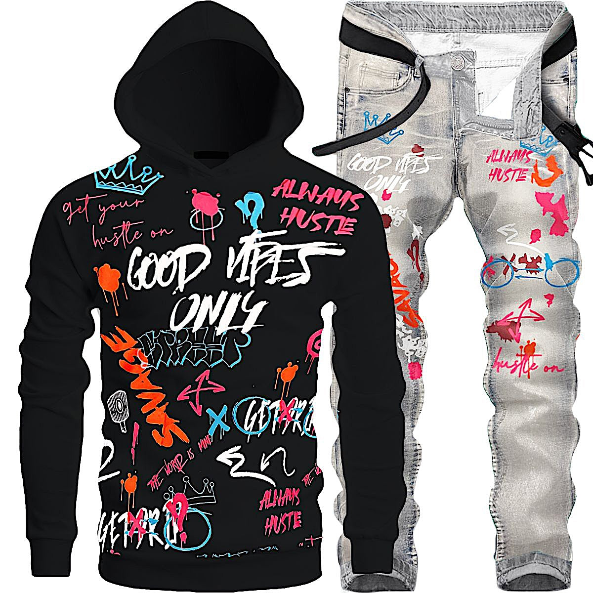 Bundle - 1133249 -Good vibes Hoodie+ Good Vibes Graffiti Jeans - BLACK+MED STONE - M1031H/M2537+ M5468D - GOTit/Waimea+waimea/RAMS