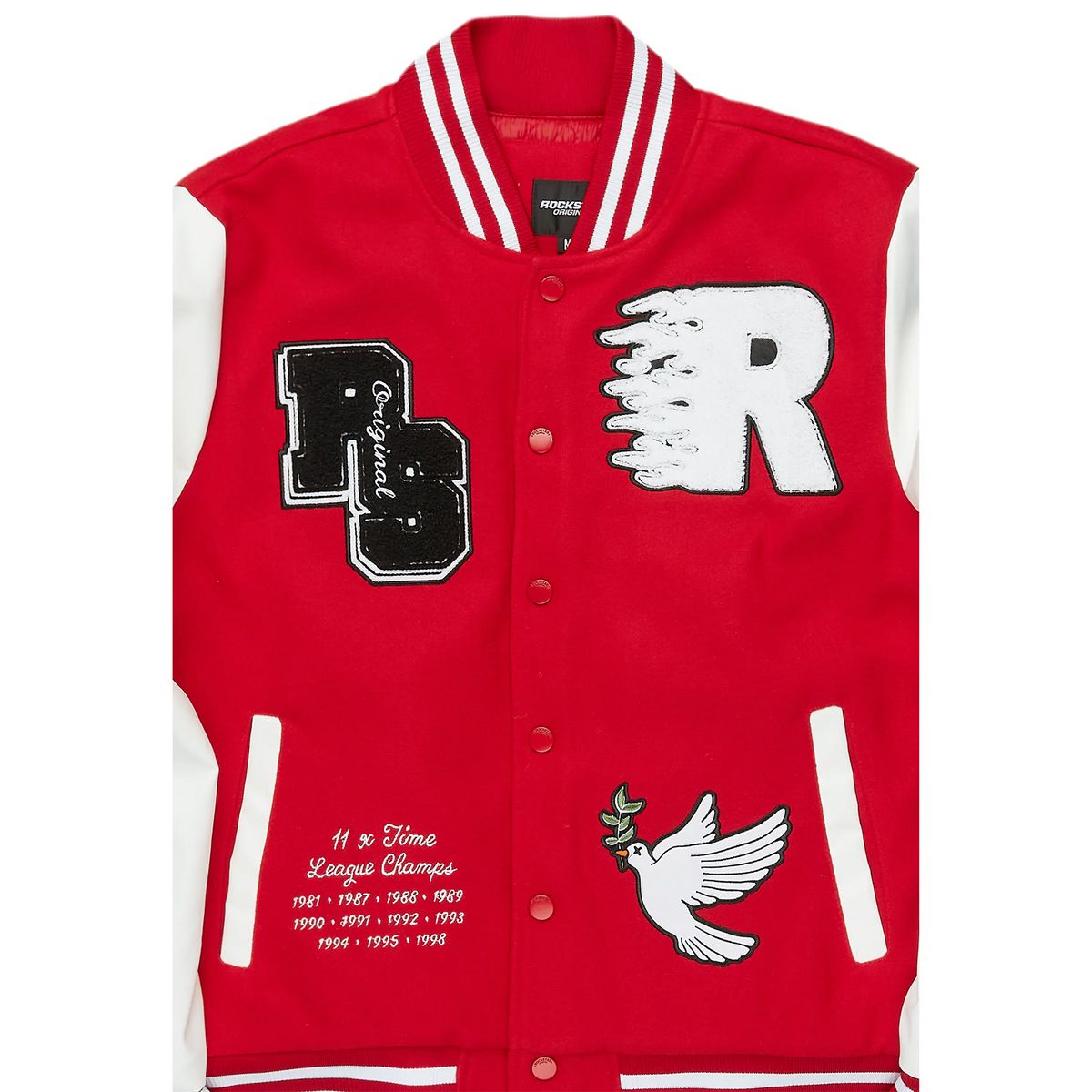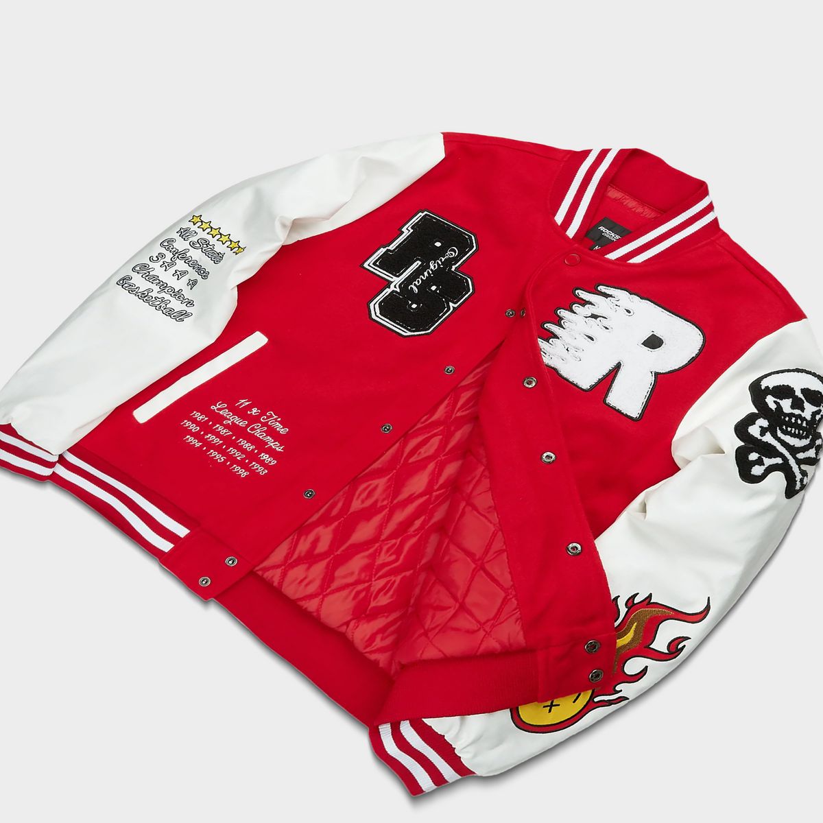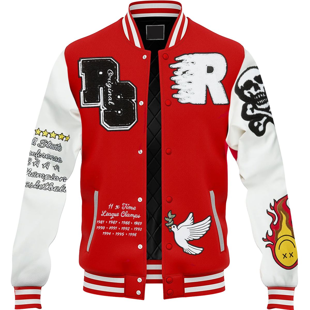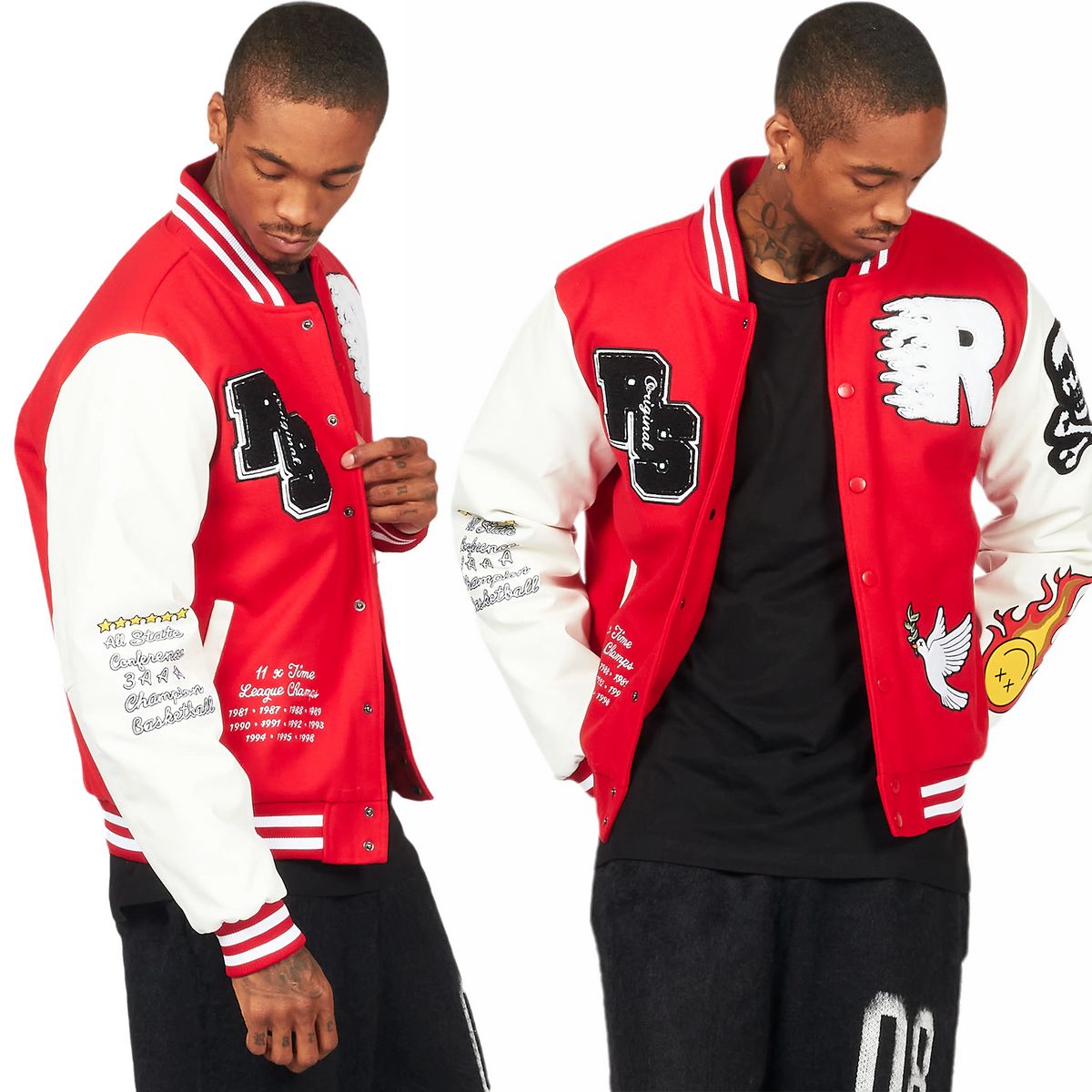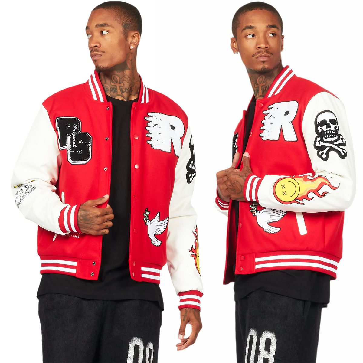 ⚡ Top Quality ⚡Jacket Sizes S-3XL⚡Rockstar Original A collegiate varsity jacket for men in red. Designed with an ultra soft fleece body and contrast faux leather sleeves for a dope urban outerwear bomber jacket. Ribbed knit baseball collar Faux leather sleeves Quilted designing Snap button closure Ribbed knit trims Dual slant pockets Hidden phone pocket Custom embroidery Graphic chenille patches