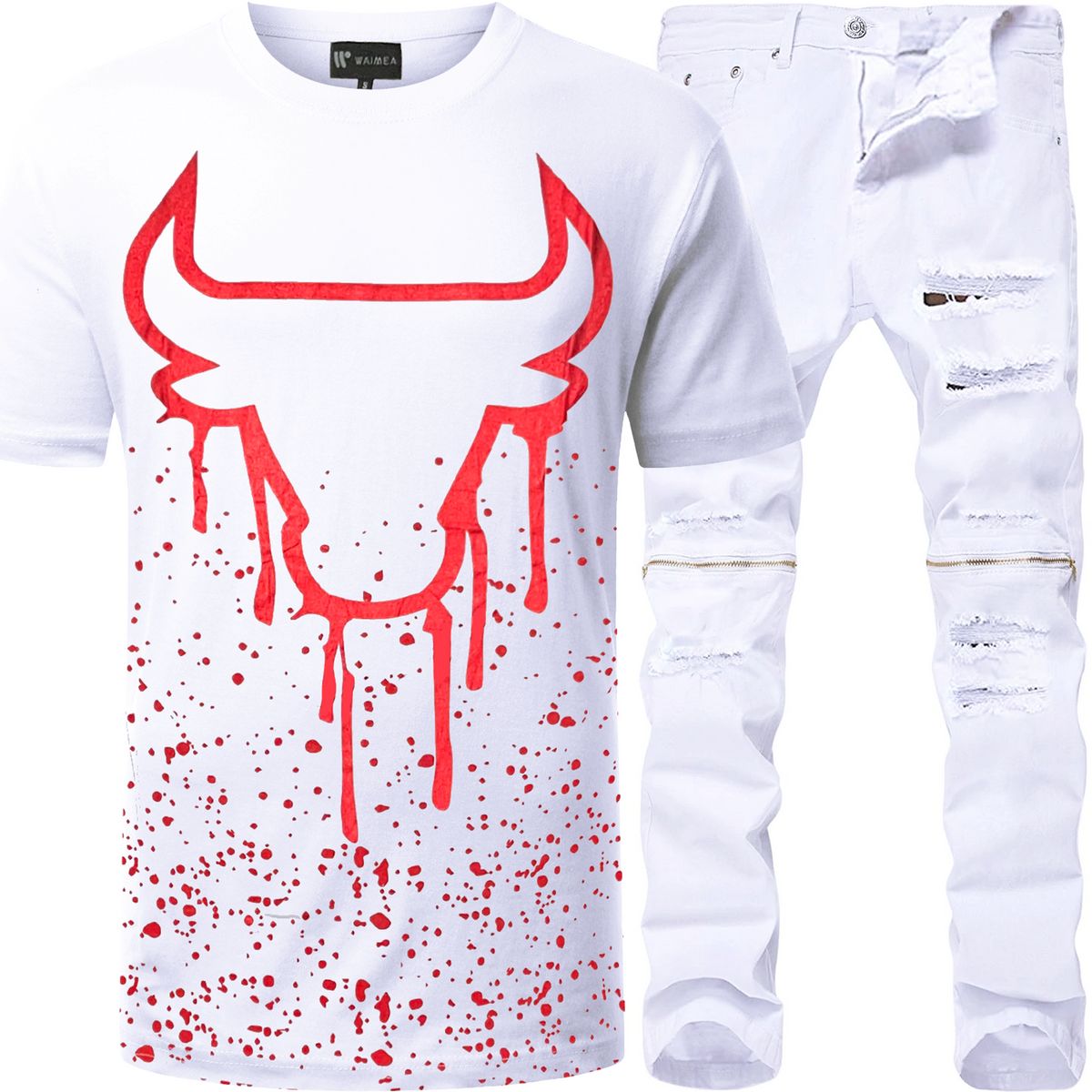 2pc Bulls Splatter T-shirt+Skinny Zippers Jeans️ ⚡️