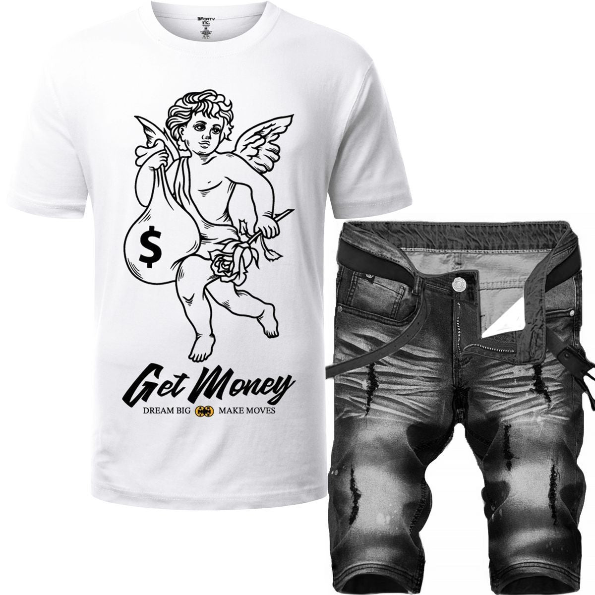 2pc Ripped Denim Shorts+Get Money T-shirt ⚡