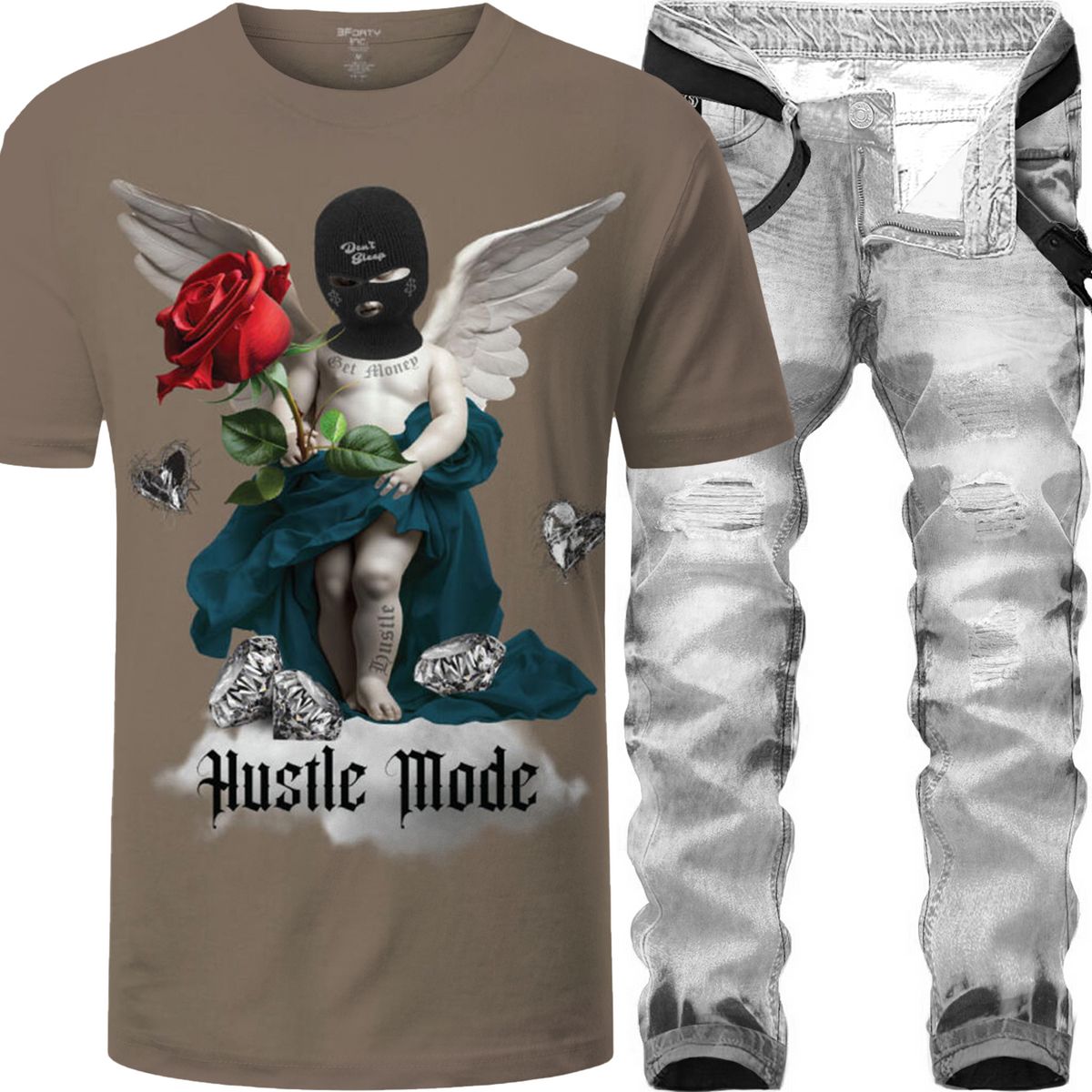 2pc Straight Iced Wash Jeans+Hustle Mode T-shirt ⚡