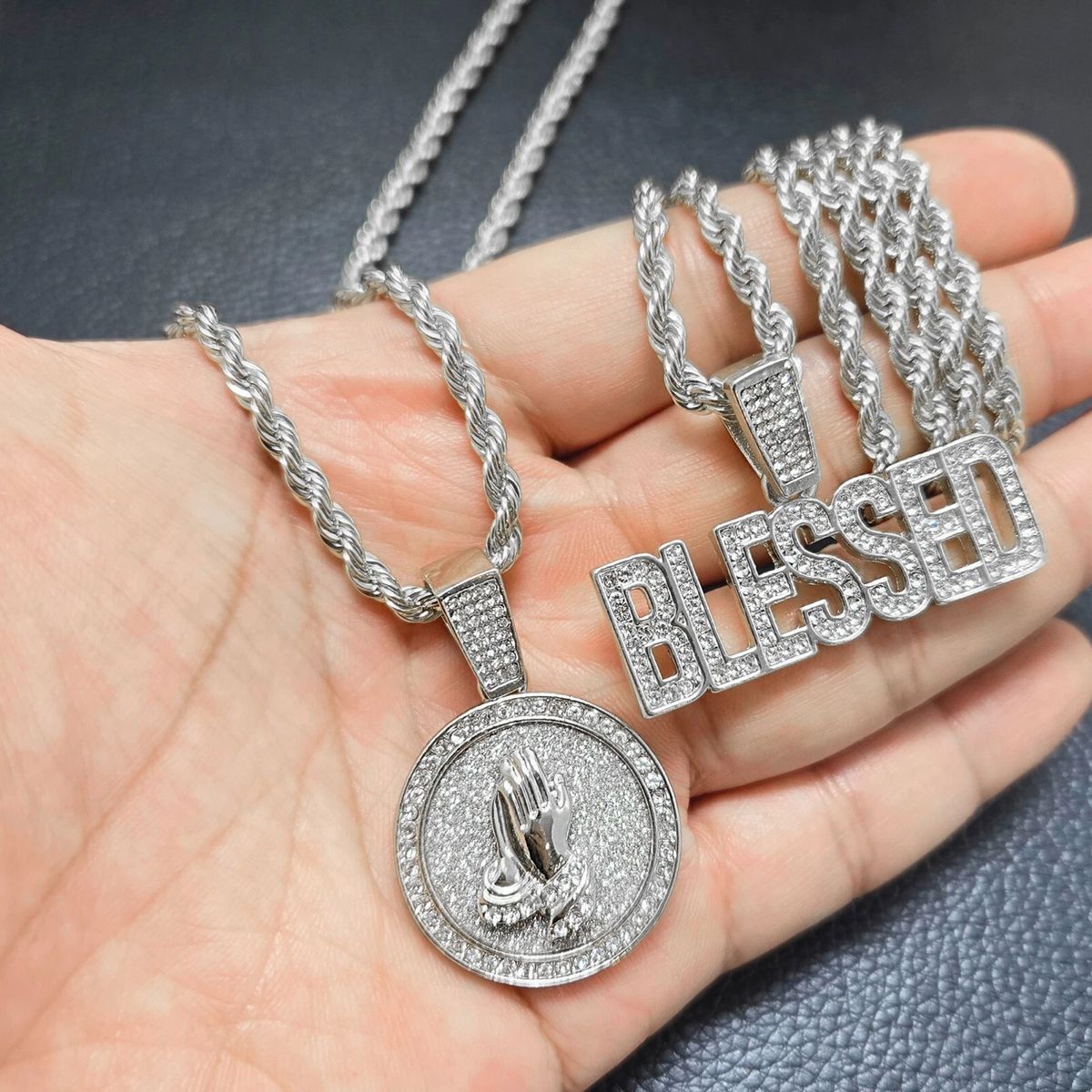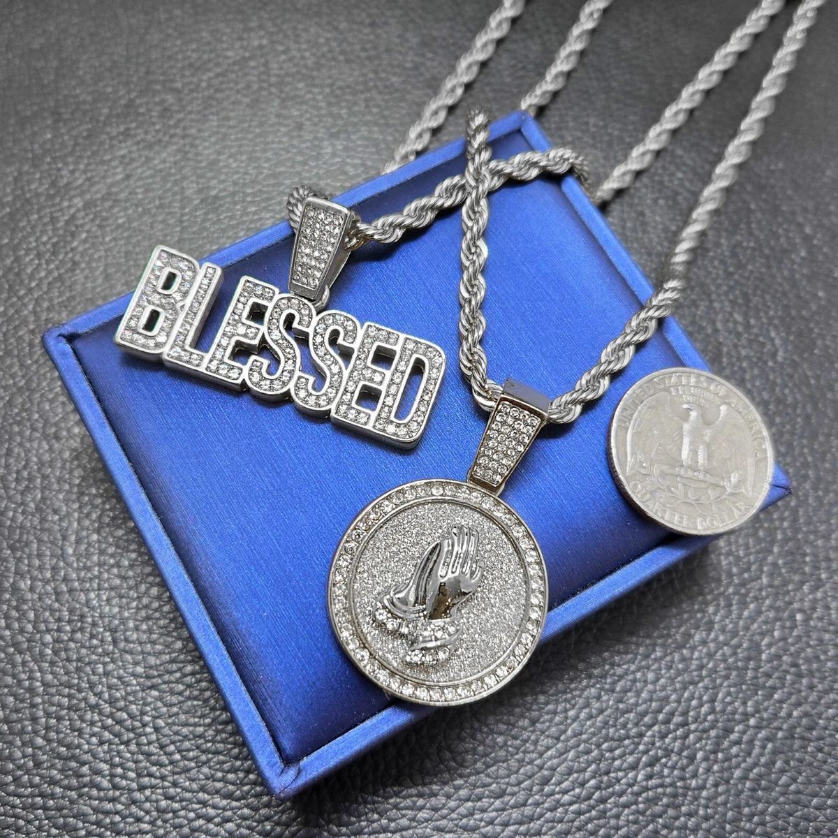 Fast & Free Shipping 🌟 Chain : 4mm 24\ Rope Chain "Pendant : BLESSED (45mm x 15mm) PRAYING HANDS (30mm x 30mm)" Plated: 14K White Gold plated High Polish