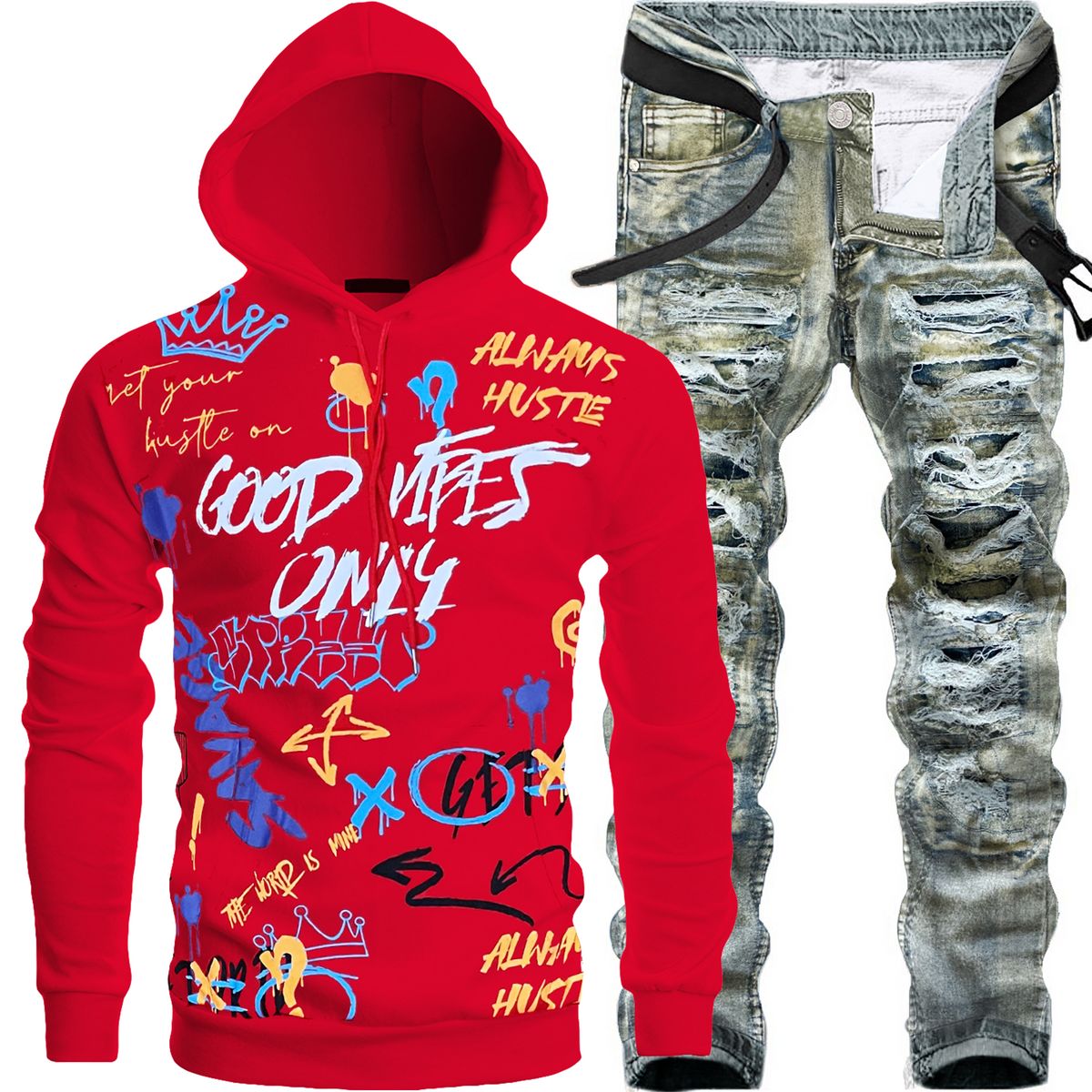 2pc Rip Repaired Jeans+Good Vibes Graffiti Hoodie⚡️