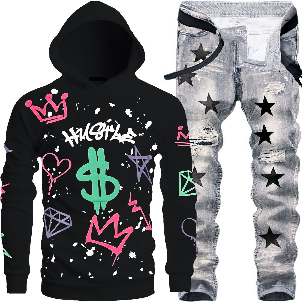 2pc Skinny Stars Jeans_Hustle Graffiti Hoodie ⚡️