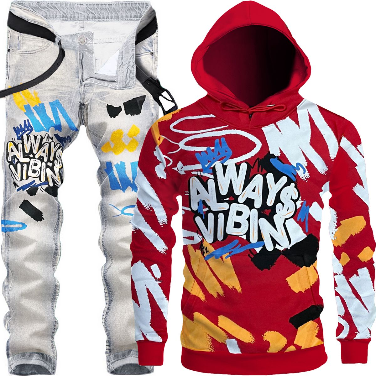 2pc Rip Repaired Jeans+Good Vibes Graffiti Hoodie⚡️