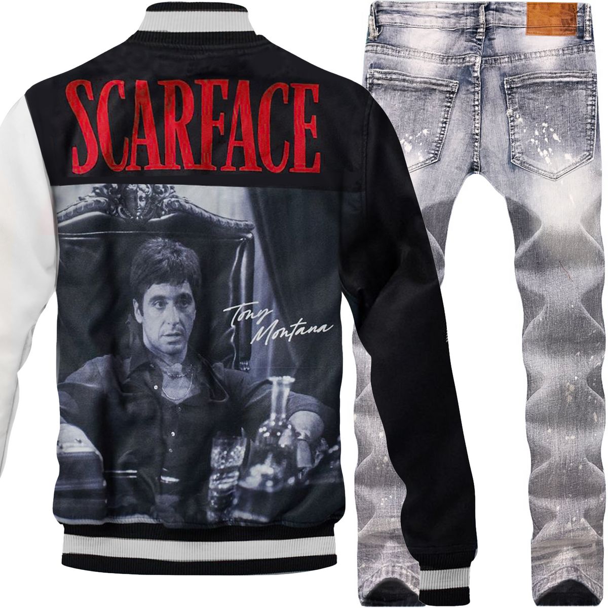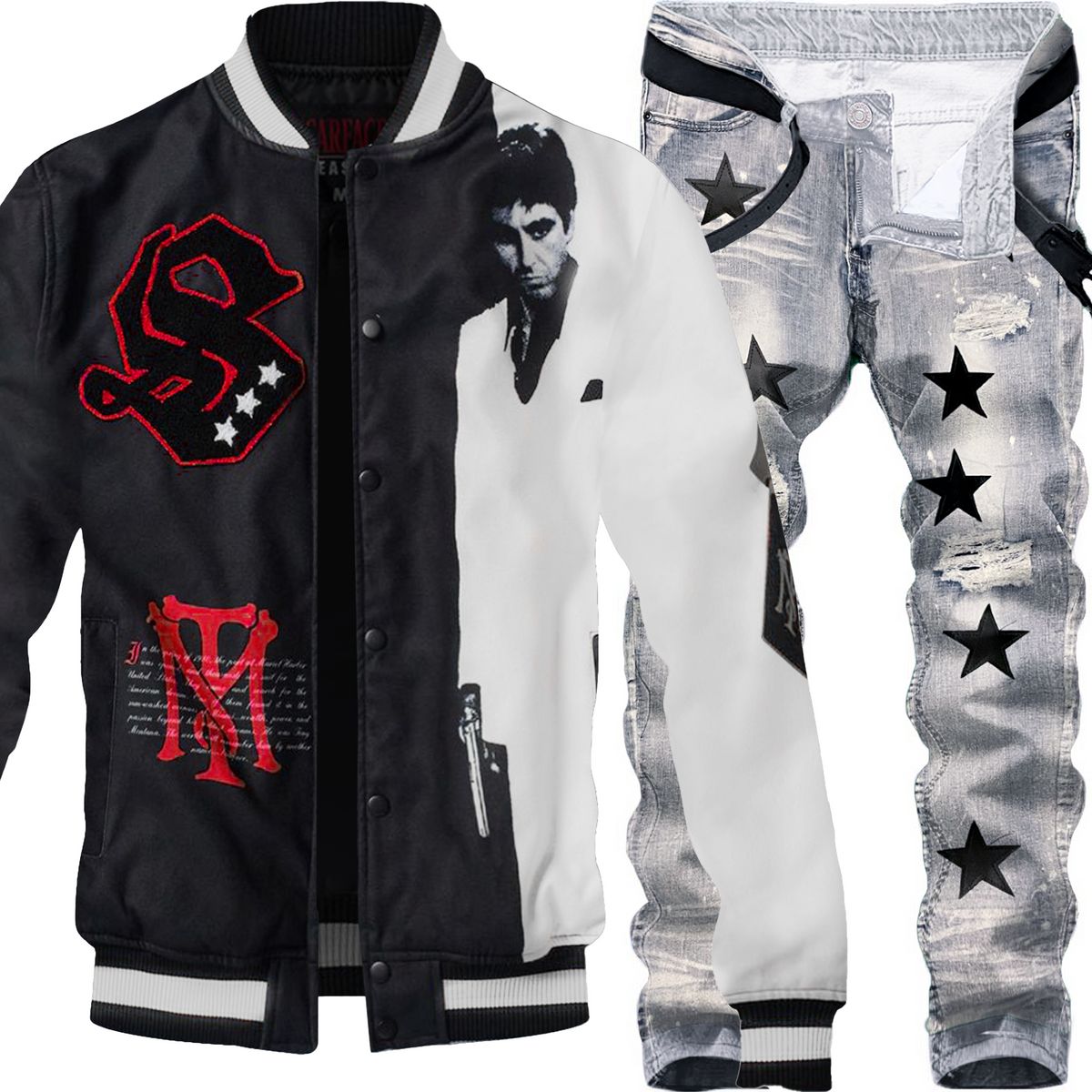 2pc Skinny Stars Patch Jeans+Reason Scarface Embroidered Jacket ⚡