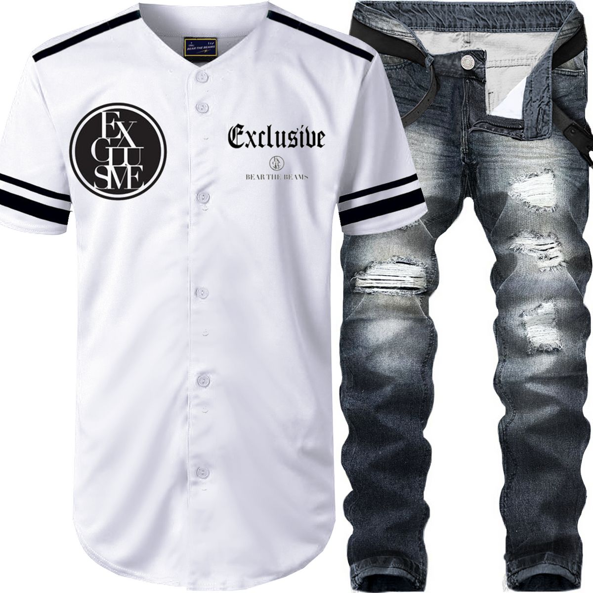 2pc Straight Ripped Jeans+2 Sides Exclusive Baseball Jersey ⚡