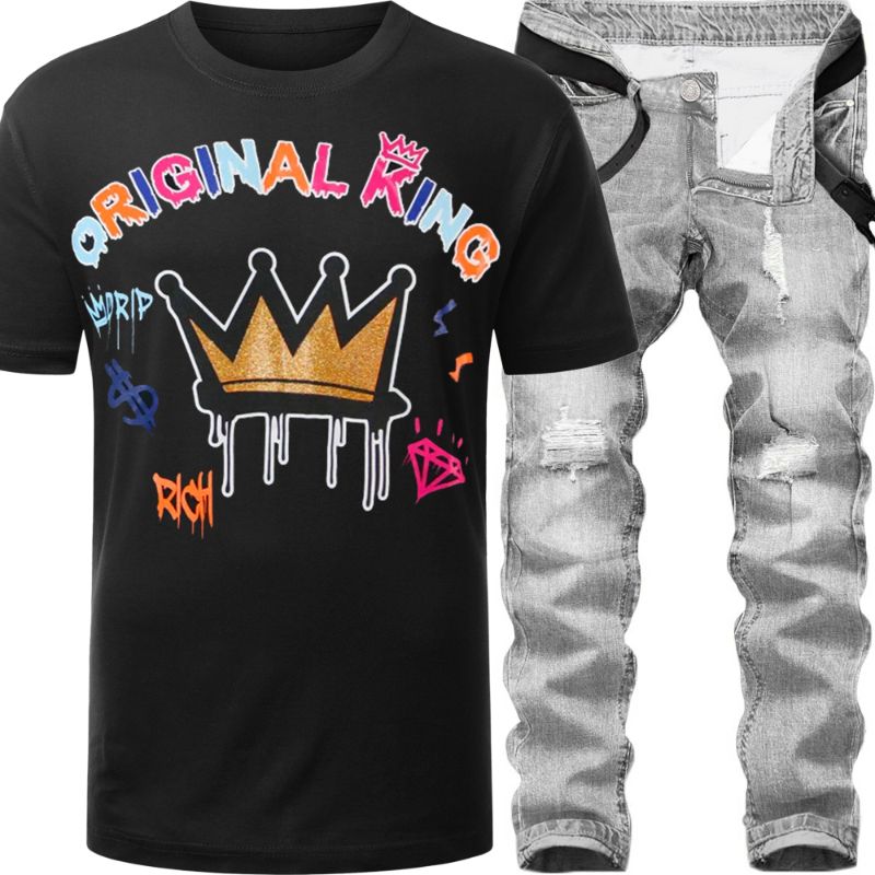 2pc Skinny Ripped Jeans+Original King Foil T-shirt β‘οΈ