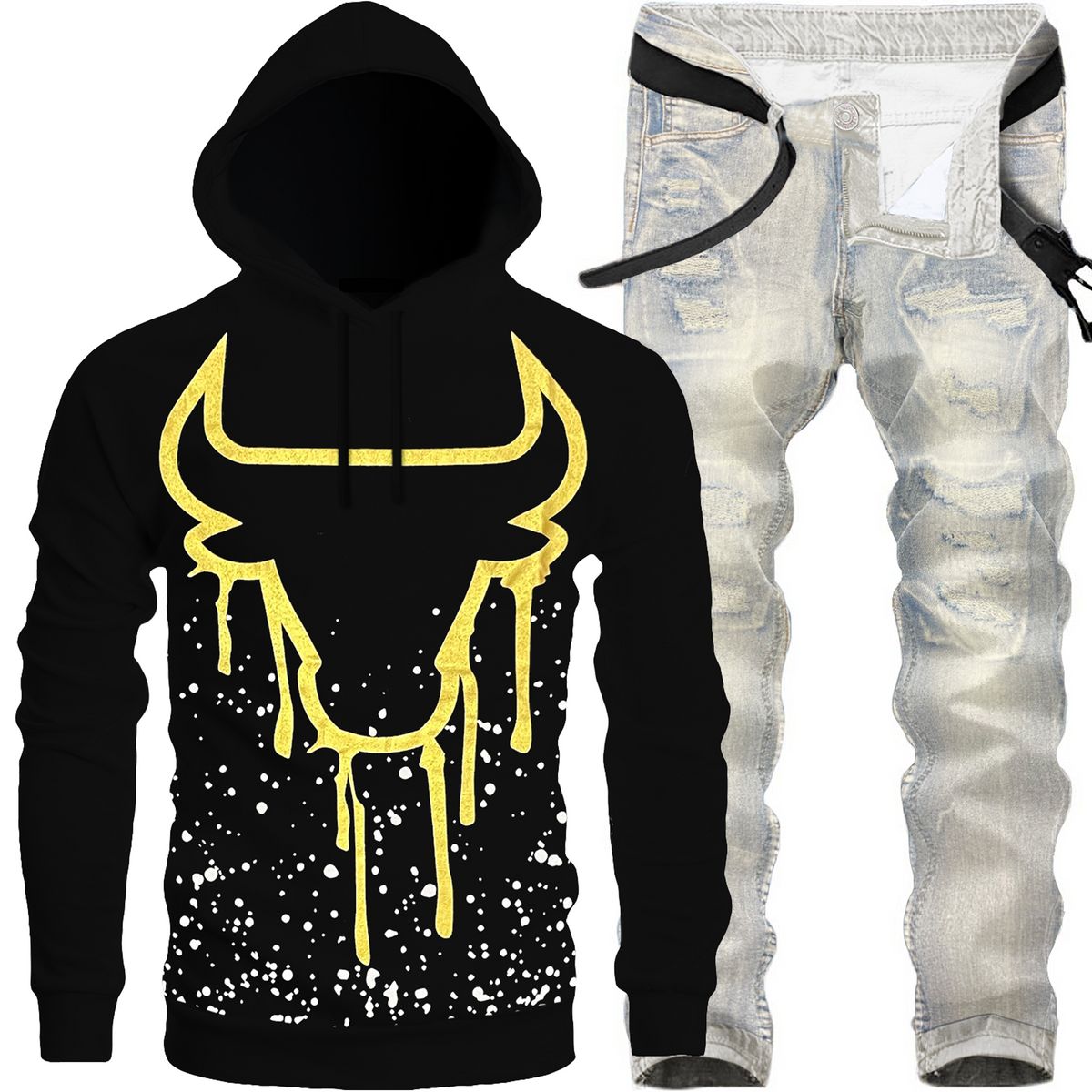 2pc Bulls Splatter Hoodie+Ripped Jeans Set ⚡️