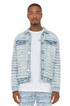 An urban denim jacket for men in blue. Designed with organic cotton and custom frayed stitch designing for a must-cop outerwear style.