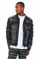 An urban denim jacket for men in dark grey. Designed with organic cotton and custom frayed stitch designing for a must-cop outerwear style.