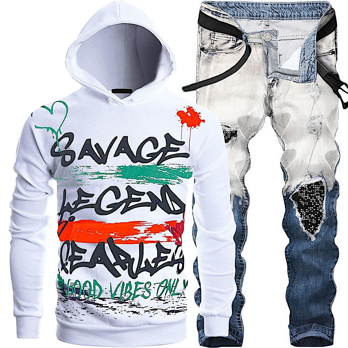 Bundle - 1142507 -savage fearless Hoodie+Skinny stones Jeans - WHITE+blue wash - M1032H/M2538/+ M4915D - waimea/RAMS