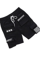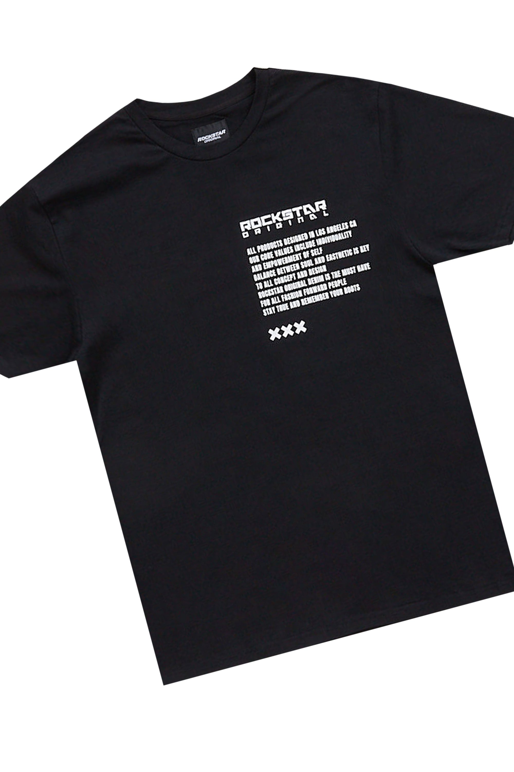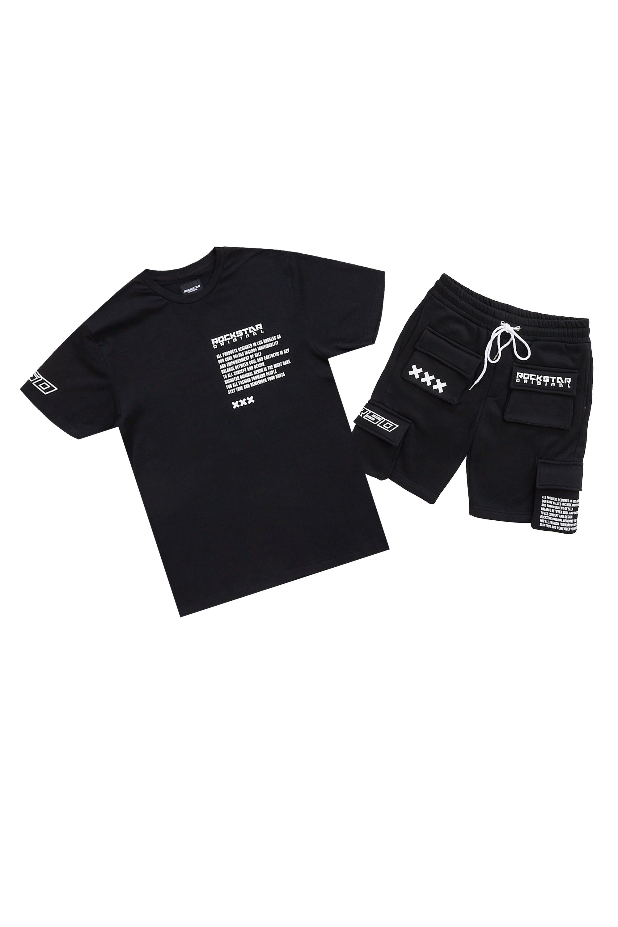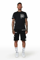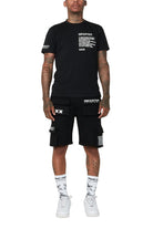 An urban streetwear two-piece tee and short set for men in black. Designed with lightweight fabric for the perfect all-in-one style.