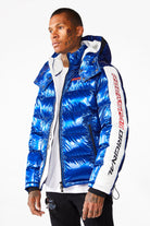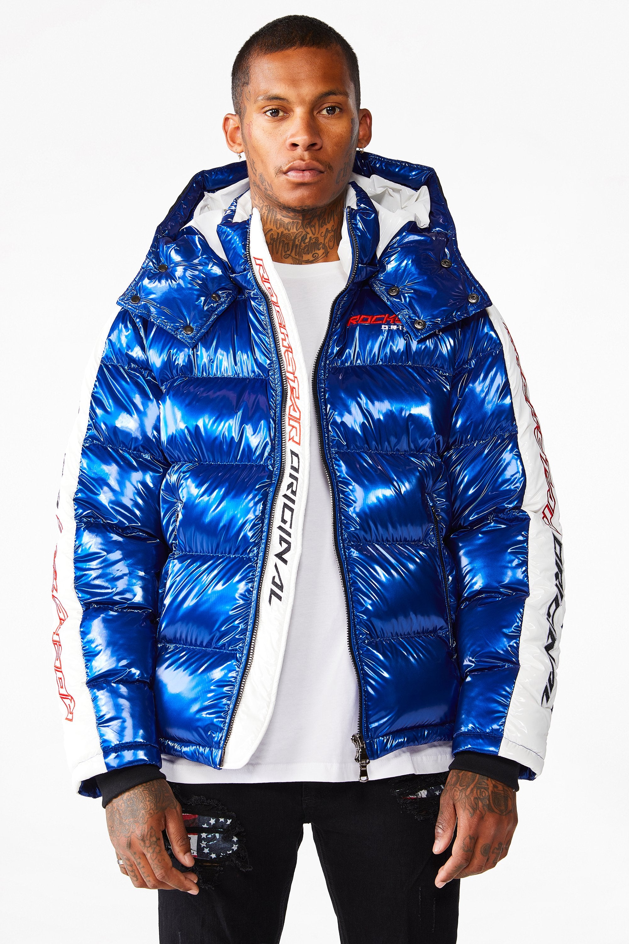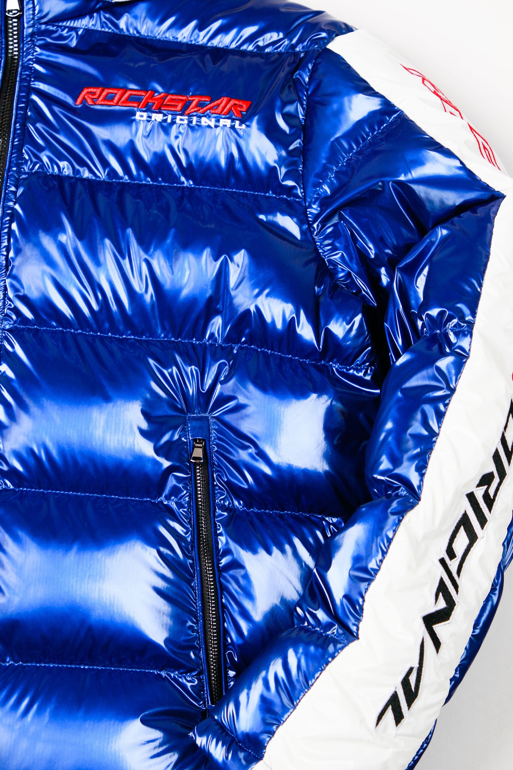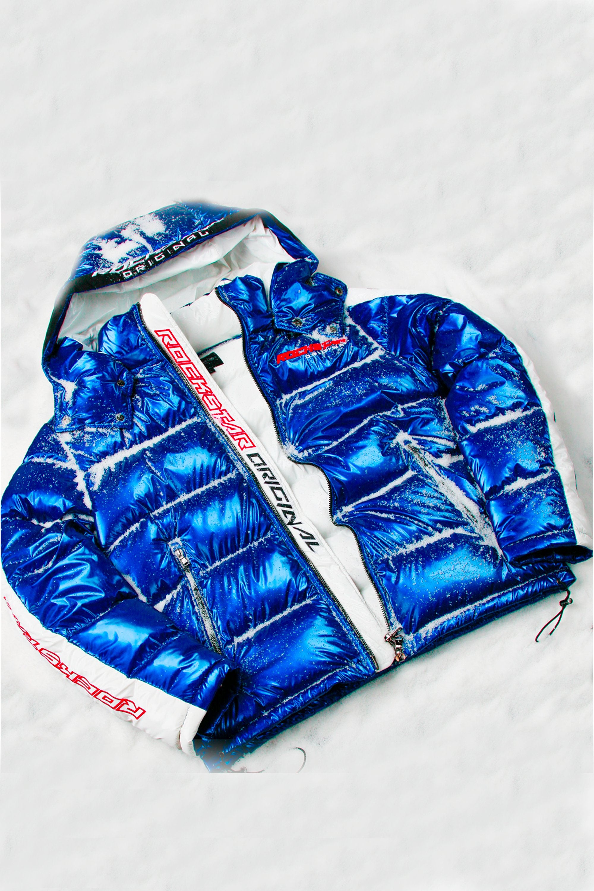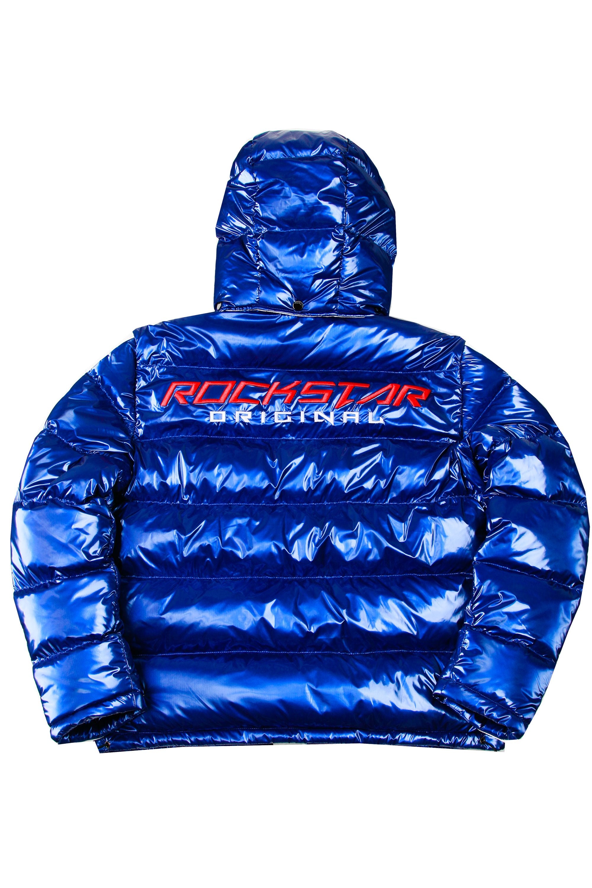 Rockstar Original Men's outerwear in brilliant blue. Featuring embroidered RSO logos and bold metallic designing throughout. Accenting versatile material to keep you cool, comfortable and functional. This new must-have is styled with a removable button hood, front zipper pockets and a high quality zipper closure.