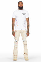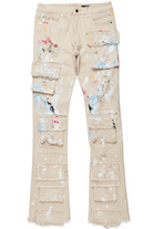 An urban stack denim cargo jean for men in beige. Designed with organic cotton and extra long legs for an essential streetwear style.
