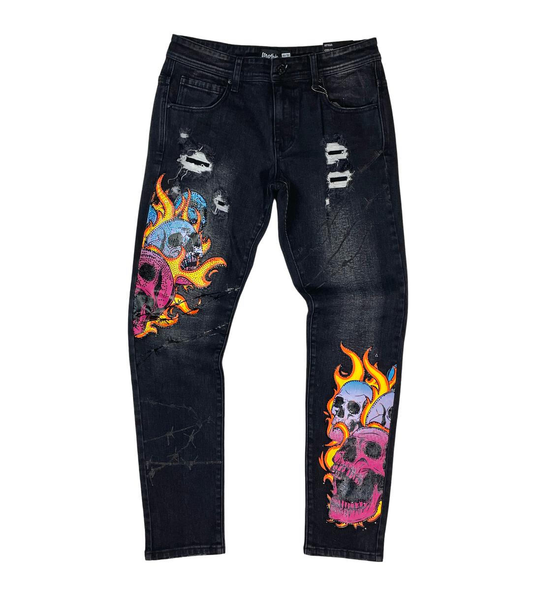 skull on fire DENIM Jeans - M16S BLACK - MOTIVE