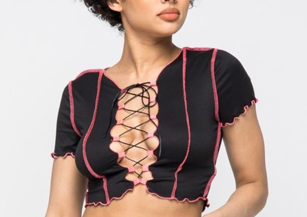 Women Crop Stitch Top -BLACK-NEON PINK -TB8920-Julia mystery